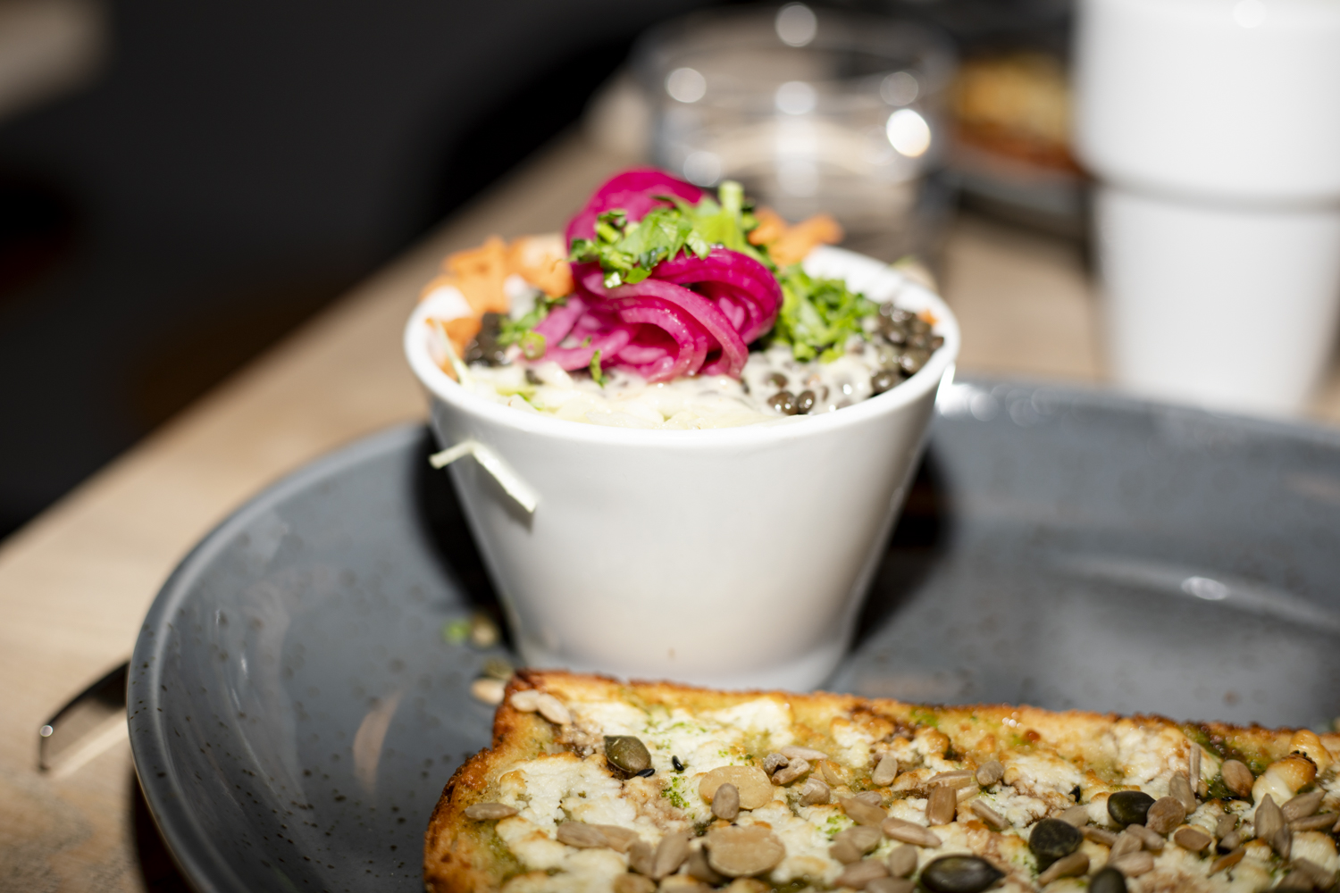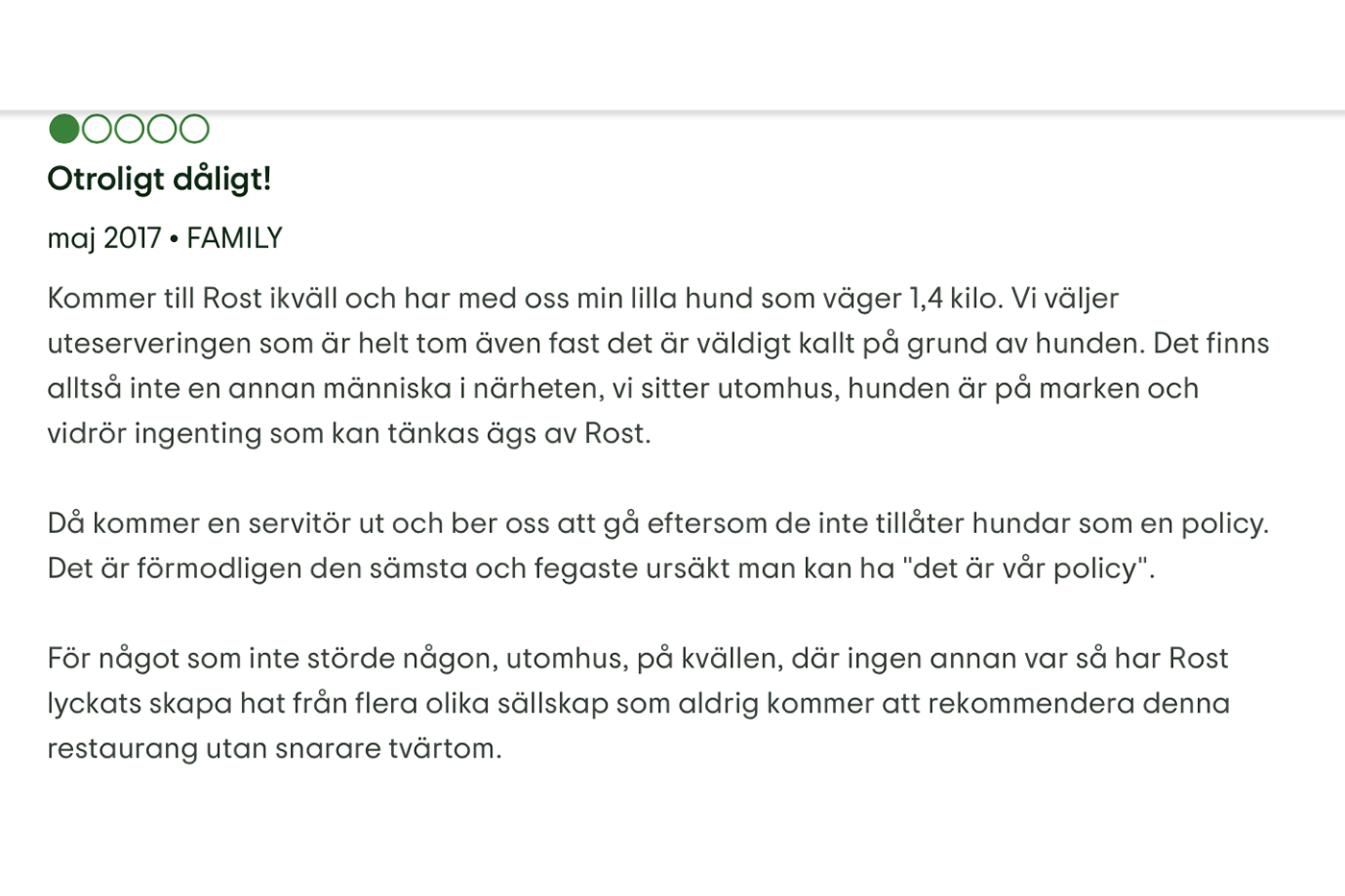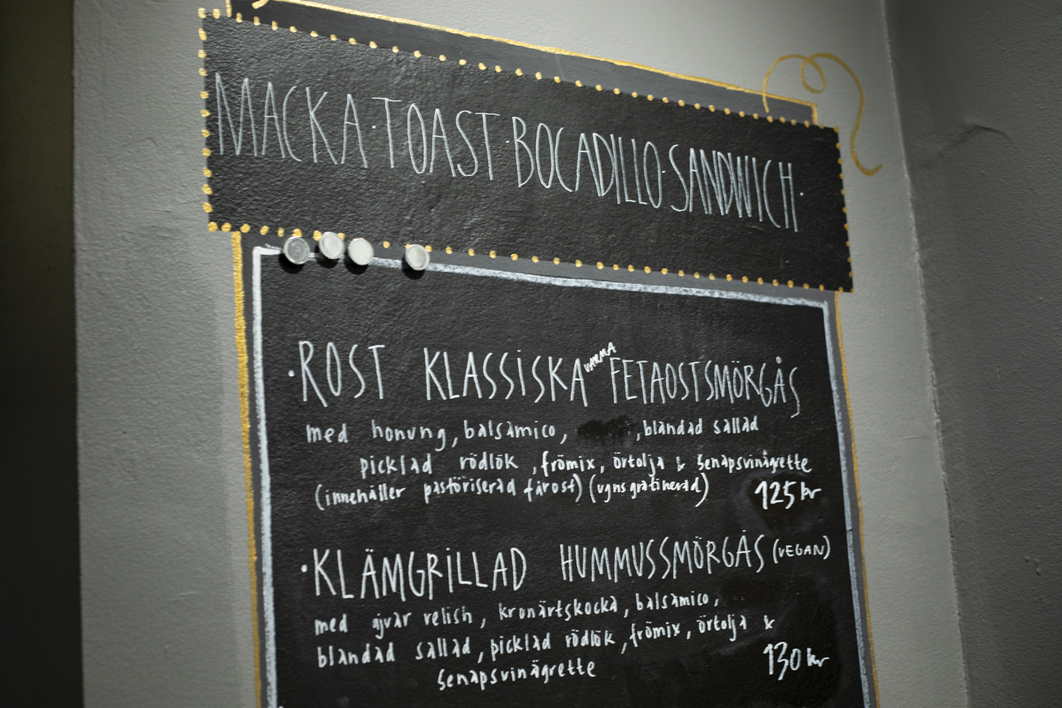 Kliver man in på Rost får man dock känslan av att vegetariskt och veganskt är mainstream i denna stad. Vill du läsa livsstilsmagasin eller titta på collage med bilder på kändisar och random ”snygga” urklipp har du kommit rätt. Det är i princip alltid fullt på lunch och jag frågar vad som gör den ”klassiska” fetaostmackan klassisk. Svaret blir att den varit med från starten för 18 år sedan och ska även ha figurerat i en artikel om Umeåmat i någon av lokaltidningarna. Balsamicon har man kokat själv och mackans örtolja är egen blandning. Just detta Levainbröd är dock inköpt från grossist men det bakas annat här. Honungen är säkert lokal. Du hör ju. Det kan inte gå fel när man blandar smält ost med sötma och syrlighet på detta sätt. Ändå tar den tillhörande salladen priset idag. Det är inte brottarportioner vilket passar mig perfekt eftersom jag är en smörgåsinfluenser med höga fettvärden, vilket annars oftast är en dålig kombo. Det är en himla god macka och när jag läser recensioner på Tripadvisor förstår jag att de allra flesta älskar Rost. Undantaget är ”flera sällskap hundägare” som riktar allvarlig kritik mot fikets ”hundpolicy”: ”Säg inte att någon blir rädd för en 1,4 kilos pomeranian.”