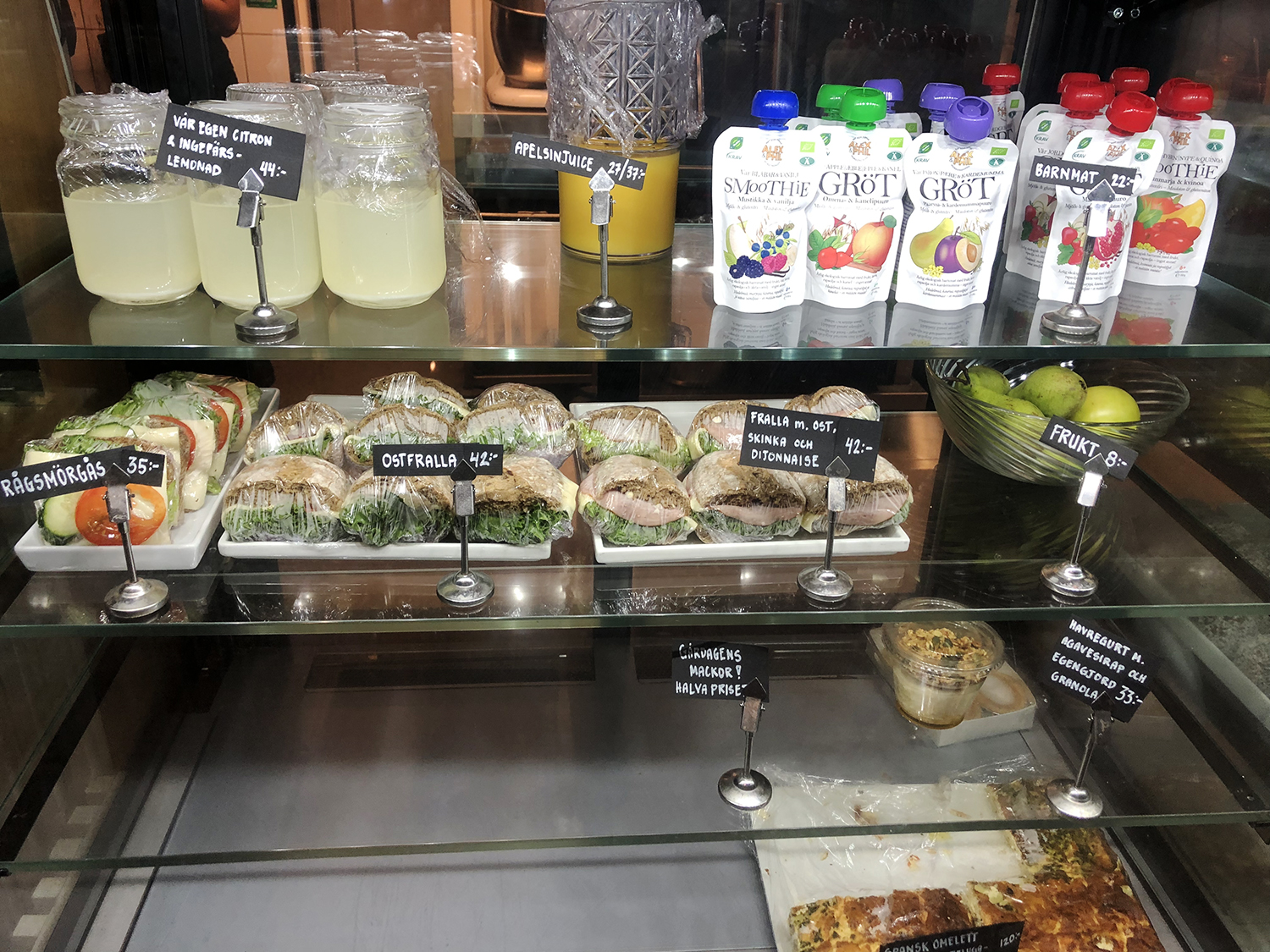 Nu riktar jag in mig på ”dagens macka”. Den finns i vitt och grovt bröd och jag frågar vilken sort som rekommenderas. Kvinnan bakom disken svarar ärligt: ”vitt bröd är alltid gott”. Tidigare har jag ätit NKs klassiker med brieost och rabarbermarmelad som är himla god om än nästan lite mastigt söt för min smak. Dagens macka är en ost (Herrgård på 28% från Norrmejerier) och skinkmacka (rökt skinka från Scan) med sallad och ärtskott. Recensionen börjar lite snöpligt med att jag biter mig rejält i tungan vilket tyvärr färgar upplevelsen. Trots detta är mackan tillsammans med kaffet god. Hade det inte varit för min blödande tunga tror jag den hade varit lättuggad och krispig på samma gång. Kanske osten och skinkan skulle behövt något mer för att väga upp den klassiska smaken. En vinägrett? Men vissa gillar vanliga ost och skinkmackor och vem är jag att döma. Att jag postat 400 mackor på Insta gör ju inte mig till en expert. Sen förstår jag att dagens mackor på NK kan innehålla ”rödbetsbiffar, haloumi och chevrékräm” eller ”varmröktlax och dillmajonäs” och dessa ska jag träffa av nästa gång jag på samma gång vill besöka och slippa Umeå centrum.